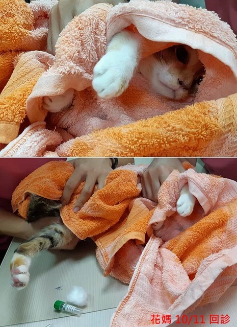 花媽是台中眷村救援一案的貓咪,當時她生活的環境很惡劣,飲食極差,生病也沒有得到適當即時的醫療,導致花媽健康情況很不好、瘦弱、持續腹瀉,協會帶她送醫檢查,除了體重過輕,還有貧血、免疫性肝炎、口炎。