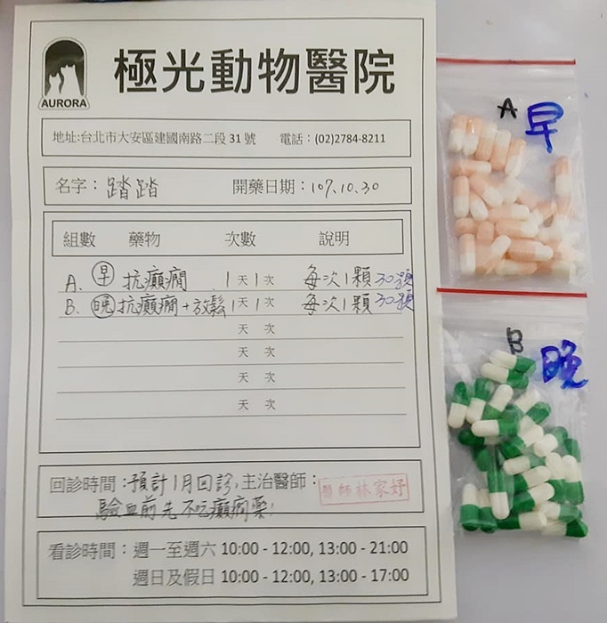 由於抗癲癇藥需由肝臟進行生物轉換,因此劑量的輕重,除了影響踏踏的癲癇外,也影響肝腎指數,所以踏踏需要定期回診抽血檢驗苯巴比妥濃度、肝臟指數,再拿抗癲癇藥每日服用,踏踏的癲癇疾病須要終身服藥及醫療,本筆醫助是踏踏於10月30日至極光醫院回診的費用,含血檢、診費、藥費,希望大家可以幫忙可愛的踏踏,謝謝大家。