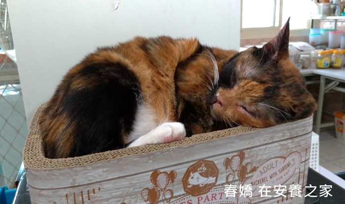 春嬌每天點眼藥控制眼壓,雖然偶有淚眼,但沒有影響到食慾精神,她喜歡坐在照護員身邊看著照護員工作,摸摸她就大聲呼嚕,還能嬰兒抱好久,個性真的很好、非常可愛,希望她一直健康開心。