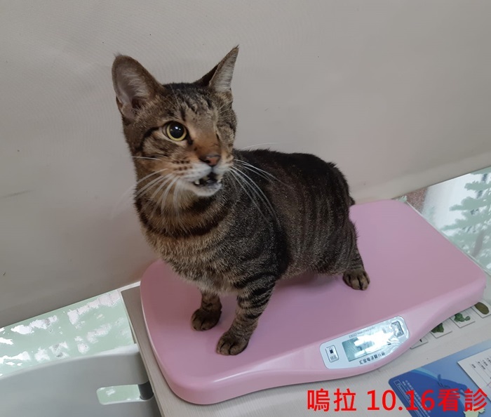 今年7月時照護員發現嗚啦體重逐日減輕,於是約診極光醫院做血檢照及x光,醫師研判造成嗚啦可能是脹氣及上呼吸道的問題使他無食慾致體重減輕,開了藥讓嗚啦吃,服藥一週後的嗚啦有改善食慾,體重也漸回升。