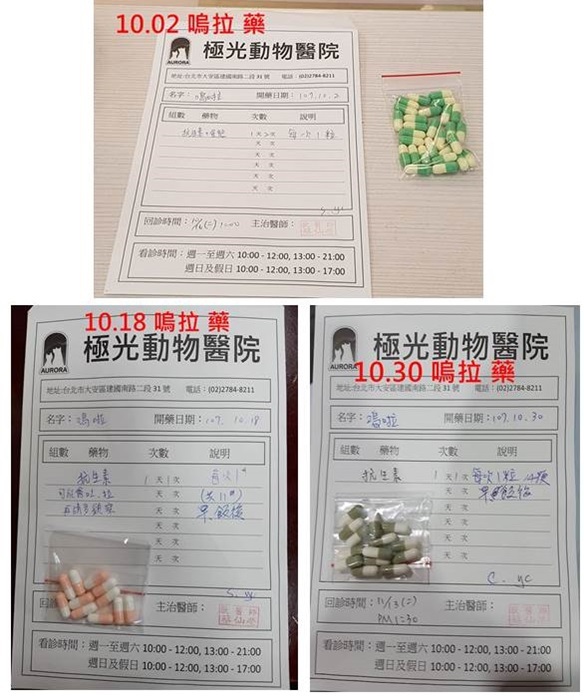 請留意嗚拉服藥後的反應,因此種抗生素是10/20開始吃的新藥,與先前的不同,是嗚拉之前在長青做的檢驗報告中列出的可用抗生素之一,但極光醫院未使用過此種抗生素,所以醫師提醒,若嗚拉吃藥後有出現嘔吐、拉肚子的情形,請立即回報醫院。