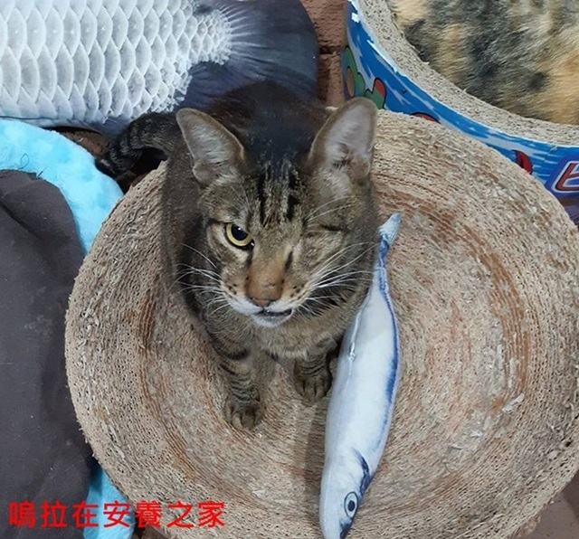 嗚啦本貓非常可愛,雖然只一隻眼睛,但是他的眼神卻非常清澈美麗,個性也十分乖巧,親人又親貓,是讓人很疼惜的可愛貓咪,嗚啦每日服藥及早晚氣霧治療,漸漸的食慾已變好,體重也回升了,照護員仔細觀察他的各種情況並做記錄,希望他的健康能越來越好。