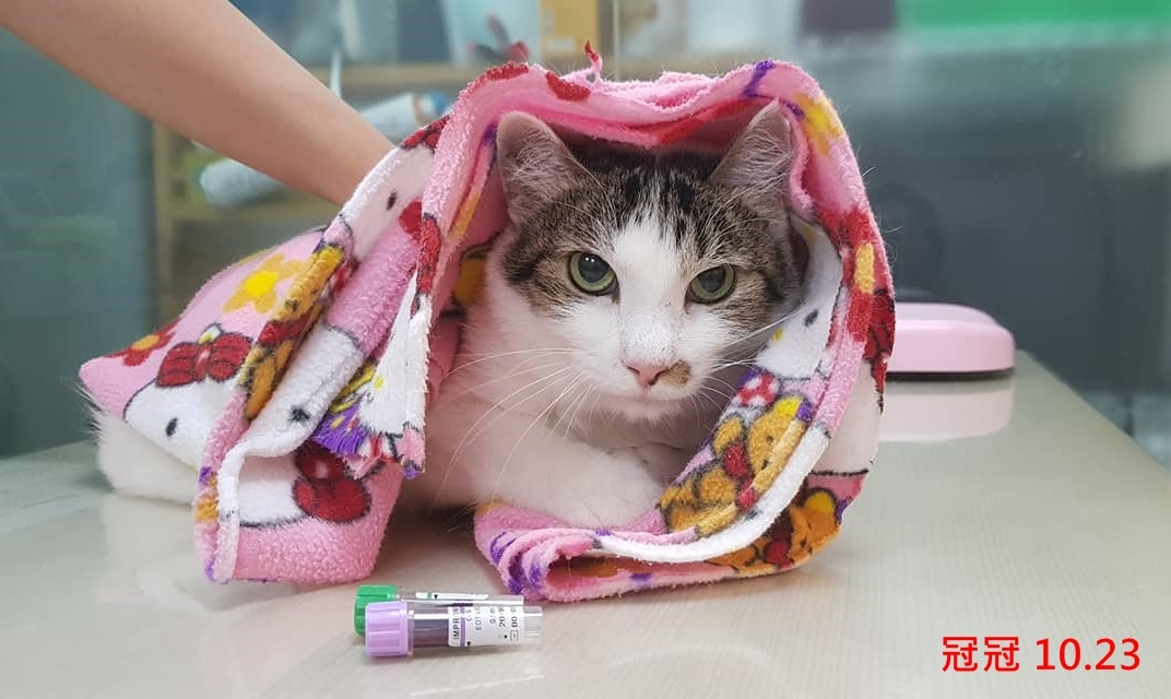 某日苗栗照護員發現冠冠食慾變差變瘦了,協會立即安排將他帶回台北協會配合的醫院檢查,檢查結果是冠冠有很嚴重的口炎,血檢結果並顯示還有腎衰的情況,因此在5/10住院進行拔全齒手術,因手術完成後,腎衰及口炎的部份都須要都繼續服藥及定期回診檢查,於是冠冠便住在台北的安養之家。