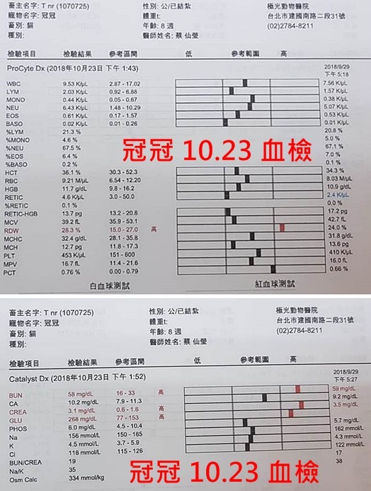 為了使冠冠的口炎及腎衰能得到有效的控制與改善,每天都須要服用類固醇、免疫抑制劑及皮下注射,且因近期血檢結果紅血球偏低,所以每週都要施打造血針,口炎及腎衰是需要很長期的醫療,希望大家可以幫忙冠冠,感恩。