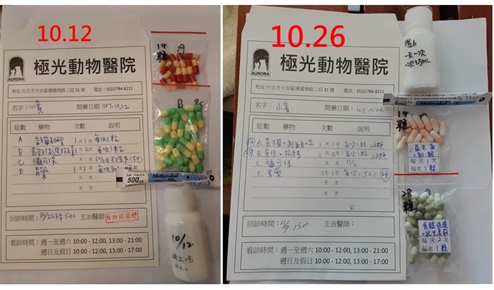 小賓的身體狀況極為特殊,每日服用抗生素、制酸劑、提升腸道機能的益生菌和很多的酵素幫助吸收營養,並定期就醫回診接受檢查,進行血檢看指數變化以調整藥物的使用量,小賓近期檢查因紅血球指數下降,因此醫療增加施打B12針,小賓的醫療是很長期的需求,累積的醫療費用相當可觀,本筆醫助是小賓於10月12日、10月26日至極光動物醫院的醫療費用,包含血檢、用藥、打B