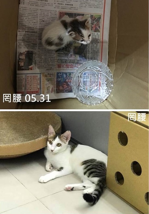 罔腰妹妹是2018年5月31日來到協會的,那日里幹事前來尋求幫忙,告知附近大樓的住戶在高達11-12樓間的夾縫,挖開木板救出了一隻受困多日的小貓咪,希望協會能夠協助,小貓咪身上有許多跳蚤,骨瘦如材,來到協會後猛吃,工作人員輪班餵她吃飯,給消化酵、葡萄糖水、貓用奶粉,漸漸她的狀況穩定了,因希望她能平安健康長大,取名罔腰。