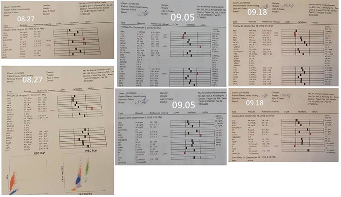 血檢結果,醫師覺得有異樣,紅血球指數一直在下降,及牙齦已好但發炎蛋白指數卻未有進步,醫師說這情況通常有2種可能性:冠狀病毒(腹膜炎)及血巴東蟲。