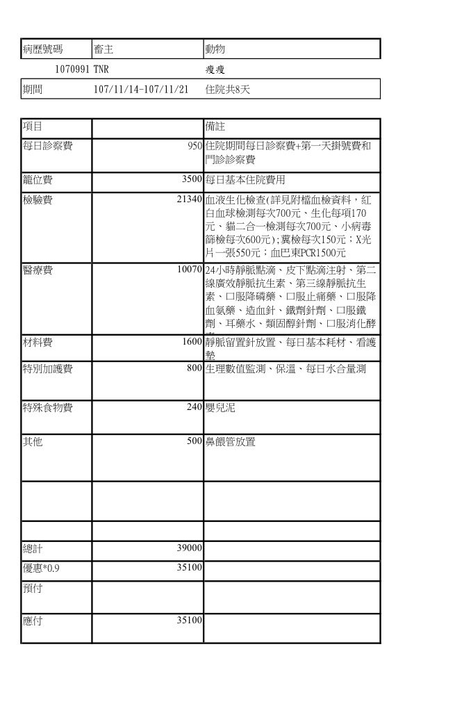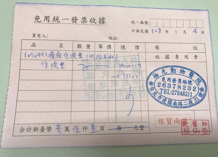 醫生做初步評估過後,醫療的過程及結果是未知數,也有可能救不回來,而醫療費用更是一個很可觀的費用,是我可能沒有辦法負擔的金額;醫生先建議我先找間有在配合救援流浪動物的醫院(費用較便宜)(新北、台北皆可只要能幫助牠)輾轉得知你們有幫忙,才寫e mail過來 謝謝,不好意思,麻煩回覆與幫忙了。動物近況說明: 因為治療七天後的結果急轉直下,醫院也評估瘦瘦未來的痊癒希望非常渺小,生活品質也無法自理,在百般猶豫跟無奈與難過之下還是選擇讓她先睡覺,不要再承受痛苦了,骨灰我也帶回家中自己樹葬。謝謝你們的幫助(血檢單子不在我這邊,在當時跟我一同前往照顧瘦瘦的男友身上,所以先放置找到瘦瘦第一時間去中日醫院急診的診斷證明)