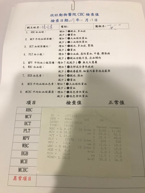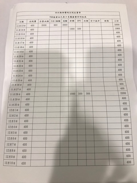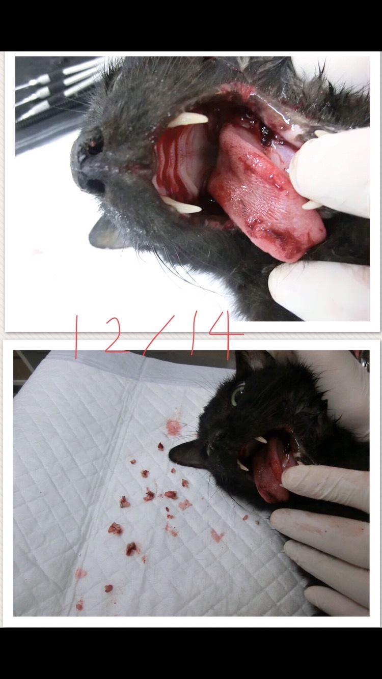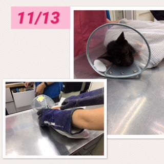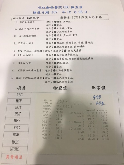 於是進行誘捕。11/13送到醫院,住院醫治。體重只有2.5Kg.然後全套血檢。血檢後發現貧血及愛滋陽性反應。11/14確定是血巴東陽性。開始治療血巴東蟲。並使用長效紅血球生成素治療貧血。黑貓很兇。住院餵藥都需要2人協力才能順利餵到藥。慢慢照顧食慾及精神都有好轉。12/14血巴東蟲治療1個月後再次血檢後發現還是貧血。麻醉檢查發現口炎嚴重。洗拔牙和順便節育。術後繼續治療血巴東蟲。和實施長效血紅素生成素。