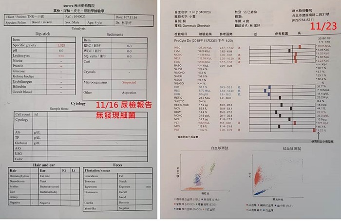 因11/09回診擠尿檢驗發現尿液中疑似有細菌,醫師加新抗生素給小賓服用一週,今回診再進行尿檢查看服藥效果。