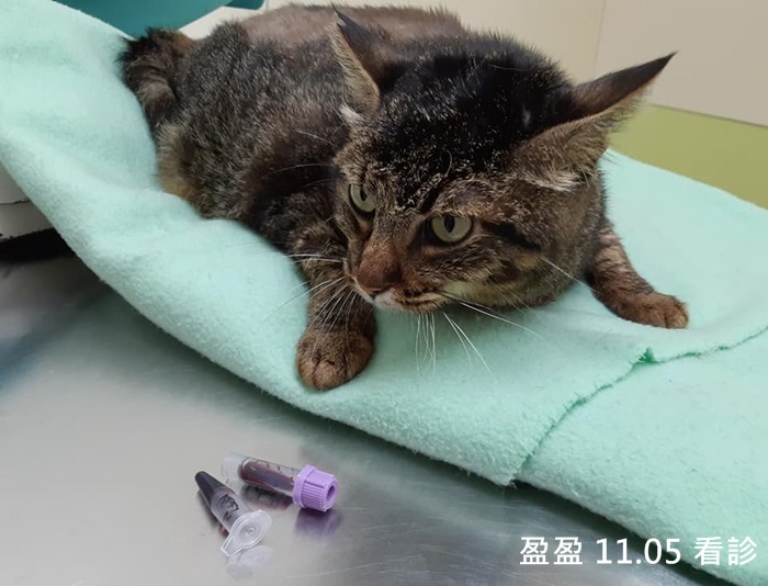 盈盈是台中眷村救援案中的貓咪,在被救援前可能歷經過全口拔牙手術,但照護不佳致口腔呈現嚴重的發炎,並有多處傷口癒合不良,血液檢查有肝指數上升與貧血的症狀,並合併呼吸道感染狀況,當時身體十分虛弱。