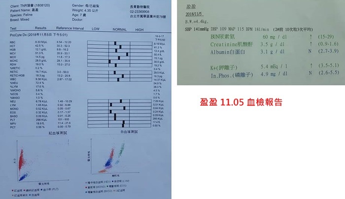 血檢結果,腎指數、磷指數都有下降,但鉀離子指數升高,因此輸液先改成不含鉀的生理食鹽水。
