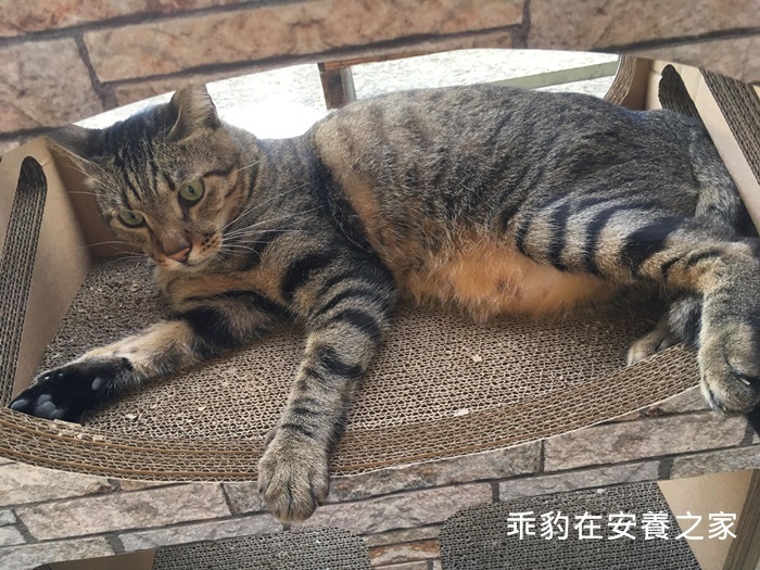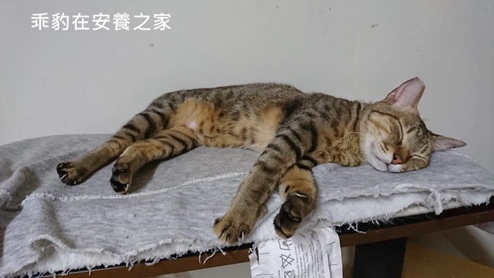 乖豹是在幾年前的颱風夜,被志工發現坐在某戶人家門口,當時他的脖子有項圈,志工在附近找尋看有沒有他的主人,但都沒有找到人,研判應是棄貓,因乖豹很親人、愛撒嬌,擔心牠會有危險,所以就先帶回家安置,之後到了協會的安養之家。