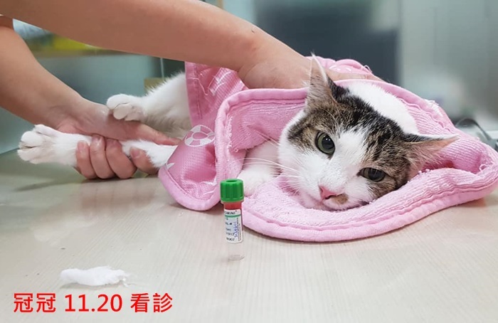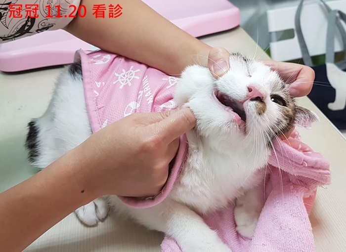 某日苗栗照護員發現冠冠食慾變差變瘦了,協會立即安排將他帶回台北協會配合的醫院檢查,檢查結果是冠冠有很嚴重的口炎,血檢結果並顯示還有腎衰的情況,因此在5/10住院進行拔全齒手術,因手術完成後,腎衰及口炎的部份都須要都繼續服藥及定期回診檢查,於是冠冠便住在台北的安養之家。