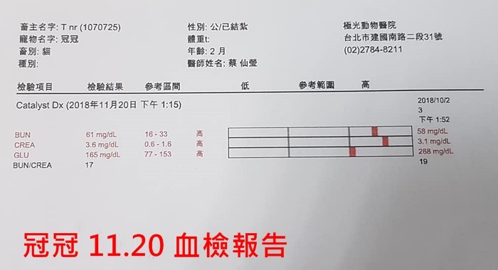 口腔狀況良好,血檢部分服用乳鉻之後血糖有下降(268->165),腎指數上升(Crea3.1->3.6, Bun58->61), 有作腎臟超音波,冠冠的腎臟影像結構看起來模糊,之前打水增量為100cc指數並沒有下降,但本周起還是微調了打水量,其他不變,#要請照護員觀察冠冠的食慾精神是否有變差或減退,再註記於工作日誌上。