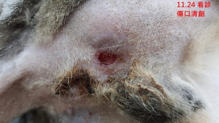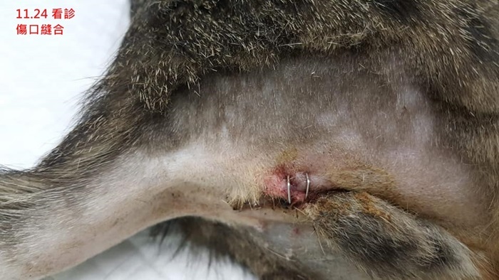 傷口與肛門腺無關,疑是咬傷或割傷,傷口稍深但不大,麻醉清創後以皮釘釘合。