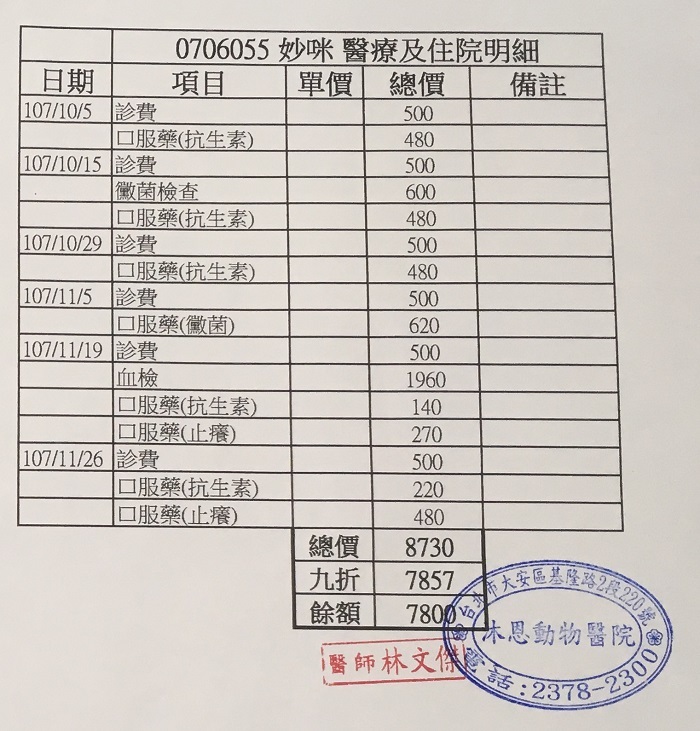 二、看診情形:妙咪先前的傷口沒有問題,但有幾處皮膚脫皮、紅腫,林醫師研判是過敏性的皮膚炎,過敏源的幾種可能性是跳蚤叮咬、更換食物、環境變動、藥物,先開二週抗生素,不須擦藥,一週後再回診看有無改善。