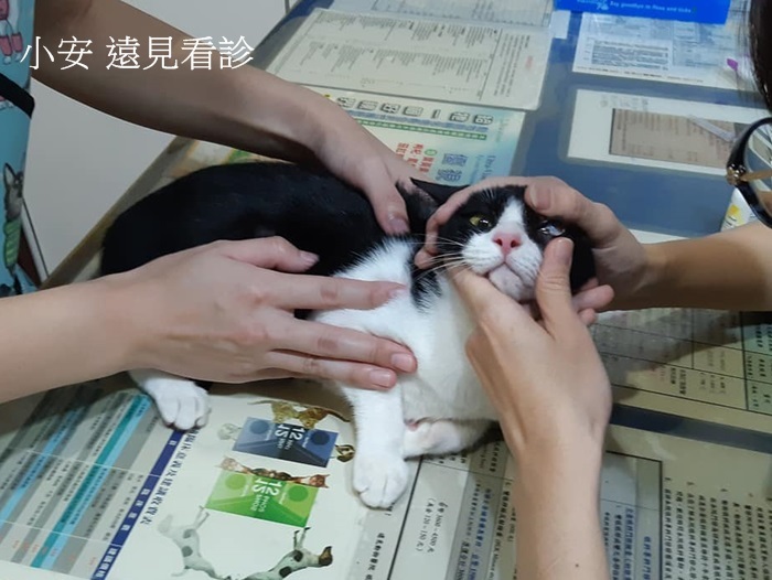 小安住院了很長一段時間,期間進行直腸復位、直腸固定、血檢、x光、驅虫、完成結紮,穩定後即接回協會安養之家照護,因小安左眼有萎縮變小情況及淚眼不斷,於是為他約診遠見眼睛專科醫院,醫師仔細檢查後,小安因皰疹病毒引起的結膜感染導致沾黏,因但情況已久,完全恢復機率不高,還好不影響視力,測量眼睛大小,並沒有萎縮,只要每日以人工淚液保養就可以維持較好的狀況。