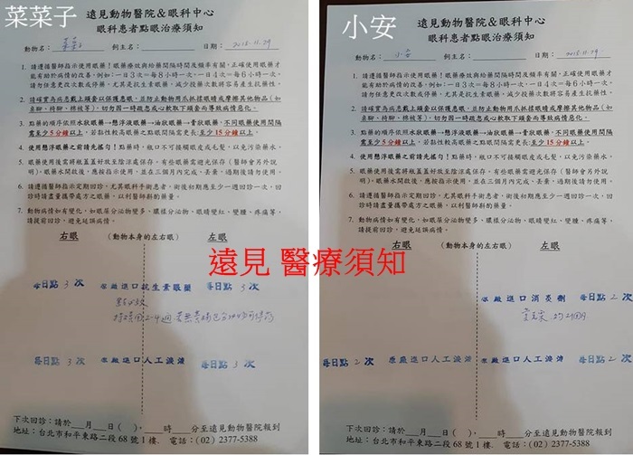 右眼檢查,神經反應正常,主要是皰疹病毒造成的結膜、角膜感染,因沒有出現黃綠色分泌物,可先以點必效及人工淚液每日數次做清潔潤滑,為期2至4週,待菜菜子滿6月齡時,再更換抗病毒的眼藥水。