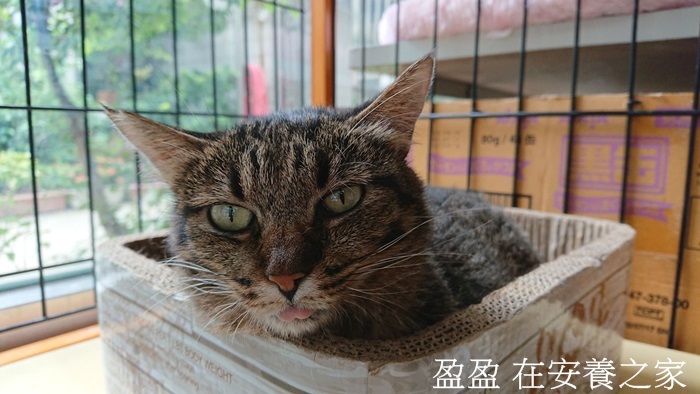 盈盈是台中眷村救援案的貓咪,她被救援前可能歷經過全口拔牙,口腔呈現極為嚴重的發炎,協會將盈盈接回台北配合的醫院治療,她身上有多處傷口癒合不良,血液檢查的肝指數上升,有貧血的症狀,並合併呼吸道感染狀況,身體十分虛弱。