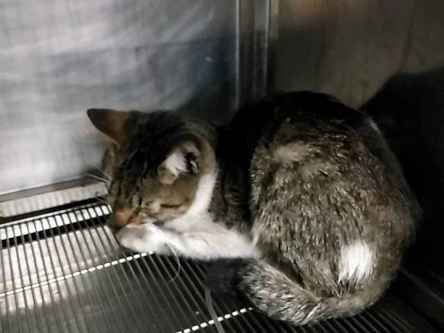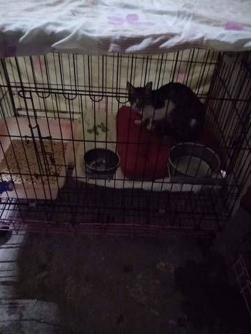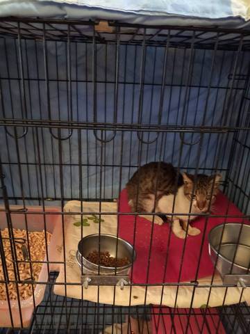 這隻濃濃大約是前年底在這抓紮的第一隻白底虎斑貓,每每王小姐來餵食時總是很愛叫的跑出來搶食,但12月初,王小姐在餵食時,發現他不是很愛吃,而且身形明顯瘦弱很多,懷疑是不是生病,經過約一星期觀察,還是覺得他生病了,於是我們就著手準備誘捕治療,經過一周的誘捕,他遲遲都只是在附近觀看,沒有進籠吃罐頭的慾望,期間我們還因為在私人所屬的空地上誘捕還被地主出言恐嚇,直到前天晚上再次誘捕時,另一個晚上也會來餵食的阿伯,趁他不注意時,一把抱住才順利捕到他。