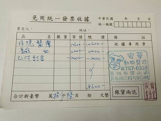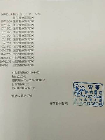 昨天經檢查,推斷是本身有貓愛滋,加上天氣變化引發的病毒感染,故留院治療兩周,希望可讓他重獲健康。動物近況說明: 白底虎斑濃濃預定住院期至1月1日,感謝安華動物醫院讓牠多住幾日,讓我們能多爭取一點時間幫忙牠。後來王小姐也上網發文尋求協助,後來中有找到熱心的好心網友協助長期安置休養,目前已進住,狀況目前良好,我們也會持續關心牠的狀況。也請大家多多幫忙牠的醫療費用。