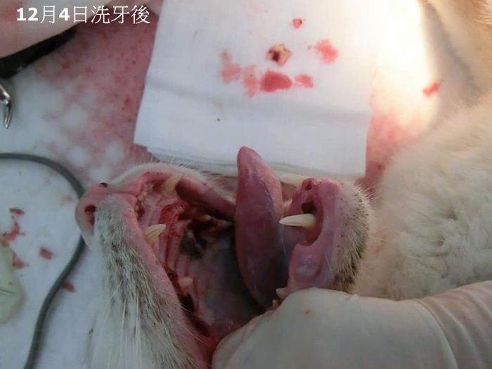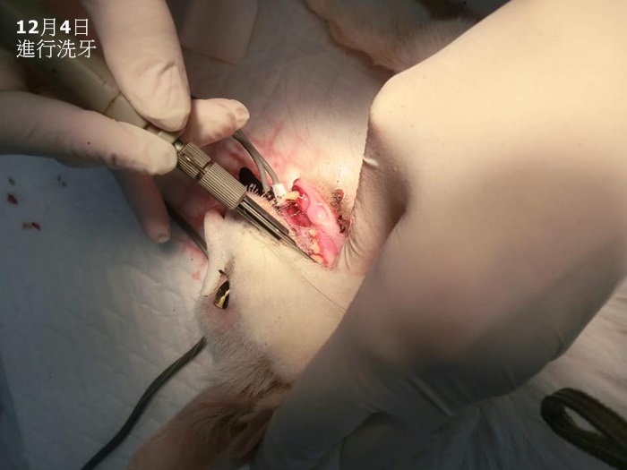 今年11月底工作人員發現黑白郎君看起來不大舒服,食慾降低、有流口水情形於是約診就醫,醫師檢查黑白郎君的口腔,發現有牙齒結石及牙齦紅腫,術前血檢,除因緊張使血糖較高外,其餘指數都正常,因此進行洗牙拔牙,並洗藥浴改善皮屑情況。