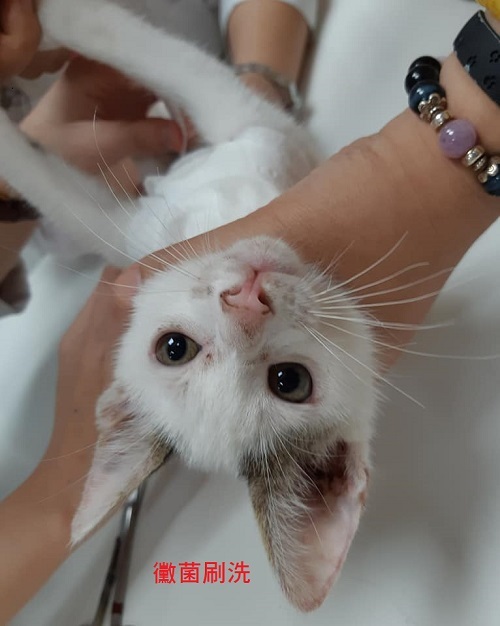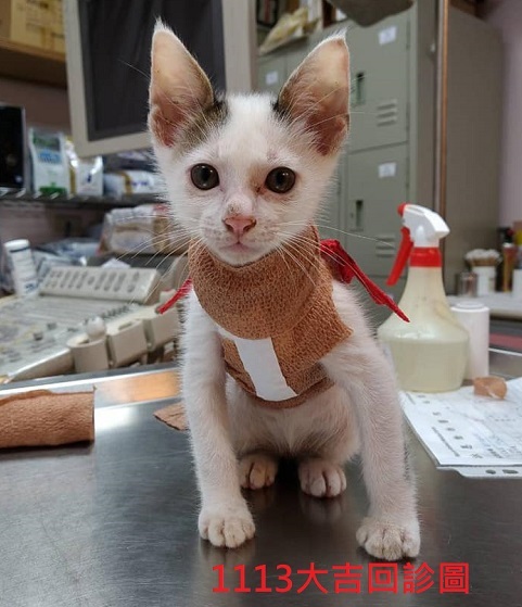 醫師說明,大吉目前黴菌情況還有點嚴重,及評估矯正衣需再穿約二週,因此建議二週後再打預防針。