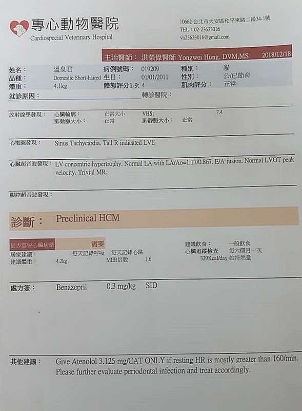 檢查完確認溫泉的心臟形狀/大小,心肌和上次檢查結果相比較沒有發現變大或肥厚,二尖瓣的狀況照舊,心超也沒有發現血栓,因此維持舊有用藥劑量,日常生活中就盡量讓溫泉情緒穩定。另針對溫泉右側頸部淋巴結及口腔上下牙齦紅腫,醫囑要進行牙周治療,由於溫泉有心臟病,麻醉時要提醒醫師溫泉的心臟病史。