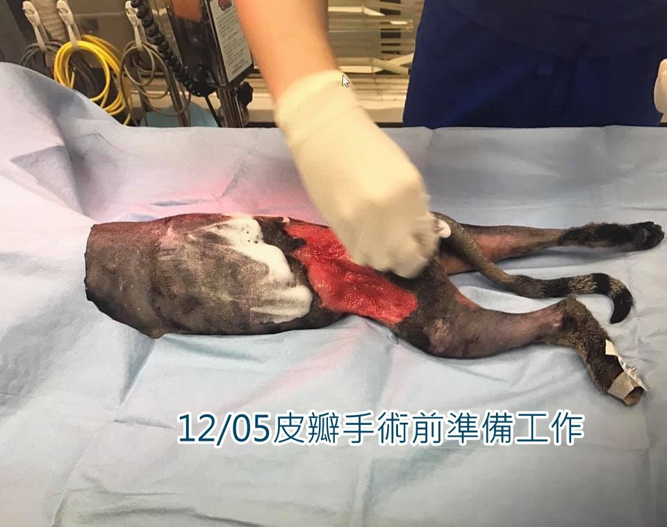 佑恩的傷口讓在場的人都非常心疼,她的背部有極大一片皮膚不見了,完全露出紅色的肌肉,每個人心裡都想著:佑恩一定很痛很痛,但佑恩仍非常地親人,她對著志工喵喵叫,一直撒嬌的模樣讓人更加憐惜。