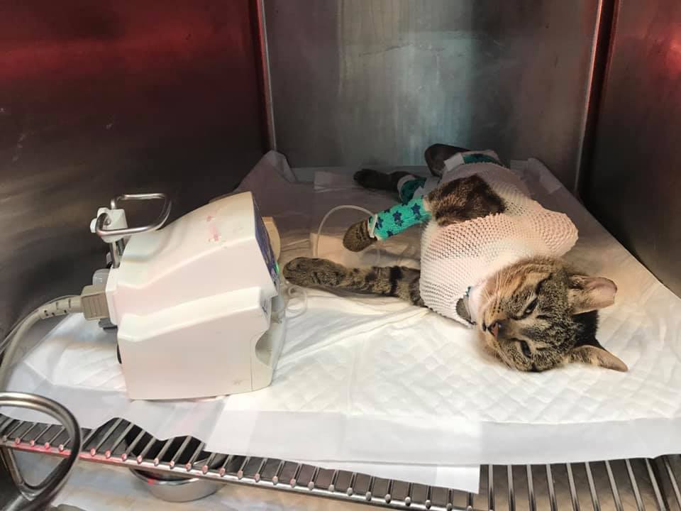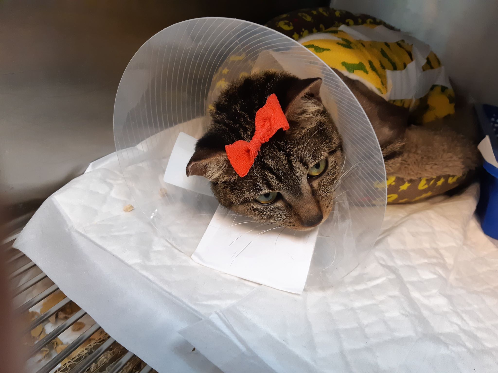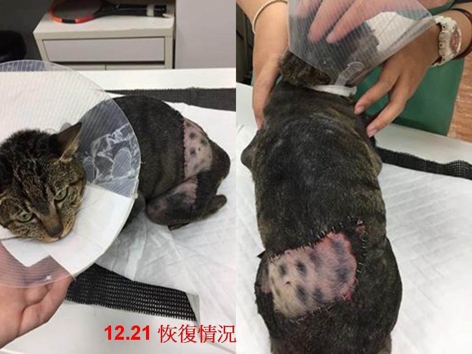 發現者先將她送去醫院進行縫合,但後續無法安置,於是上網找到一位中途可以幫忙,沒想到傷口縫合又裂開,造成更大的開放性傷口,以及照顧期間貓咪可能因掙脫頭套舔傷口,致傷口擴大,再加上營養不良(中途提供素食),送醫治療月餘也不見好轉,高雄志工與貓友不忍心貓咪狀況惡化,於107年9月底尋求協會幫助,改至協會配合的沐恩醫院進行治療。