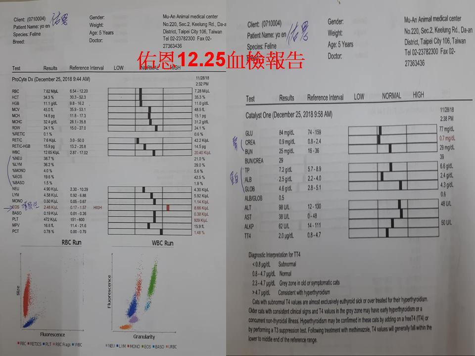 今日血檢結果,除嗜酸指數偏高,其餘都正常,嗜酸指數與寄生蟲有關,佑恩住院期間,分別於11/19、12/25點過全能貓驅蟲,再請觀察。