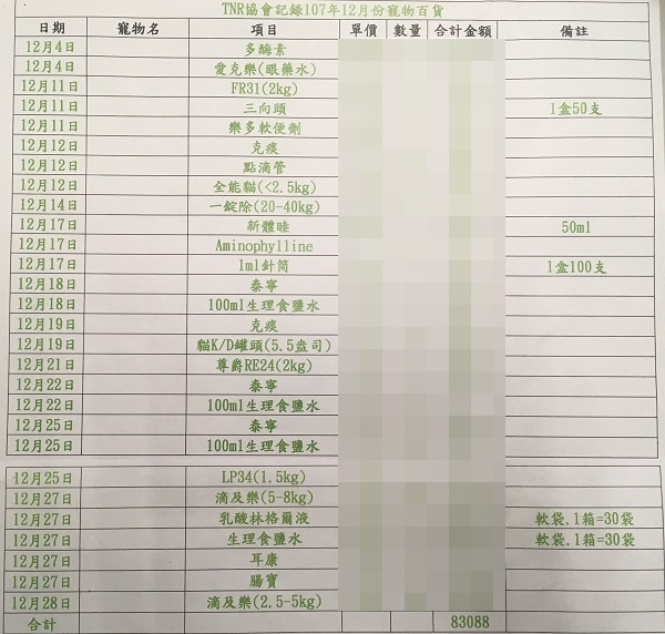 主題: 安養之家貓咪107年12月份的醫療用品 申請者姓名: 臺北市支持流浪貓絕育計劃協會 花色: 申請日期: 2019-01-24 19:47:23 申請者部落格: 申請者臉書網址: 所在縣市/合作醫院: 台北市/欣旺動物醫院 治療費用: 83088元 需求人數: 172人 已結案 (2024-05-31 18:36:37) 報名人員: 林嘉南 x4(已付款)、張巧虎 x4(已付款)、Jill Peng(已付款)、皮爾斯(已付款)、無名氏(已付款)、捲子貓 x4(已付款)、吳小喵 x2(已付款)、heyblack x2(已付款)、devin(已付款)、Eric Shen x6(已付款)、Eliza x4(已付款)、Ti Wei Hsu x4(已付款)、多多 x6(已付款)、Avv Urtyuii x4(已付款)、PiPi0608 x6、PiPi0608 x6(已付款)、簡佑銘 x2(已付款)、alice(已付款)、Wei Jhen Zeng(已付款)、克拉拉(已付款)、無名氏(已付款)、Terara(已付款)、Emily Yen(已付款)、徐德阿咪(已付款)、77doris(已付款)、GreenFire(已付款)、心桓(已付款)、何小姐 x4(已付款)、Mia Jheng(已付款)、無名氏、無名氏(已付款)、Nikita x2(已付款)、洪凱威(已付款)、簡佑銘(已付款)、漪(已付款)、Faa(已付款)、a-song x2(已付款)、蘇艾倫(已付款)、蘇艾倫(已付款)、張恩 x2(已付款)、sandy_huanglichuan x2(已付款)、twchen18 x2(已付款)、Chiayun Lee(已付款)、黛咪 x3(已付款)、陳派佐(已付款)、connie242 x2(已付款)、Szumin Yu(已付款)、掩日(已付款)、HANAPAPA x4(已付款)、DK(已付款)、gill x2(已付款)、Nana x2(已付款)、tina(已付款)、bonne.tseng x2(已付款)、Erin Chen x2(已付款)、Sasara Lin x2(已付款)、楊亞蒨 x2(已付款)、gill x2(已付款)、無名氏 x2(已付款)、蕭泰咪 x2(已付款)、陳奶油(已付款)、Angel Lin(已付款)、Alan Tseng(已付款)、Jeff x2(已付款)、Ruby x4(已付款)、小靜 x2(已付款)、Joyce Tsai(已付款)、lin789 x4(已付款)、洪凱威 x2(已付款)、Emily Yen(已付款)、Jasmine Lin(已付款)、小玉(已付款)、gill x2(已付款)、Bella Chen x2(已付款)、昭昭 x2(已付款)、Bear(已付款)、Mace x2(已付款)、Gloria Lin x2(已付款)、uihnd(已付款)、Mong x6(已付款)、寶逼咪咪 x2(已付款)、HANAPAPA(已付款)、李吱吱(已付款)、Forgod Ho(已付款)、陳昱先 x2(已付款)、Ab ku(已付款)、波納Bonheur(已付款)、咚咚和申語霏(已付款)、catheaven(已付款)、Vicky x2(已付款)、華華(已付款)、三歲羡羡 x2(已付款)、 候補人員: 動物病情說明: 安養之家許多貓咪在被救援當時都是身染重病或身受重傷,在經過手術醫療後就住進協會安養之家接受照護終身,這些貓咪或有慢性病、或有傷病後遺症,各別要許多藥物、食品、營養品以維持他們的健康穩定。