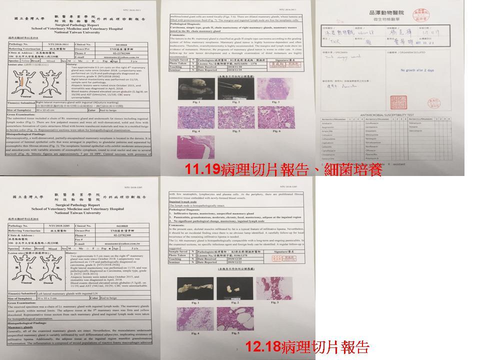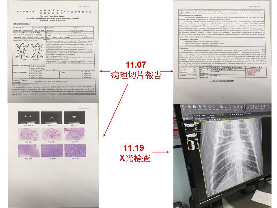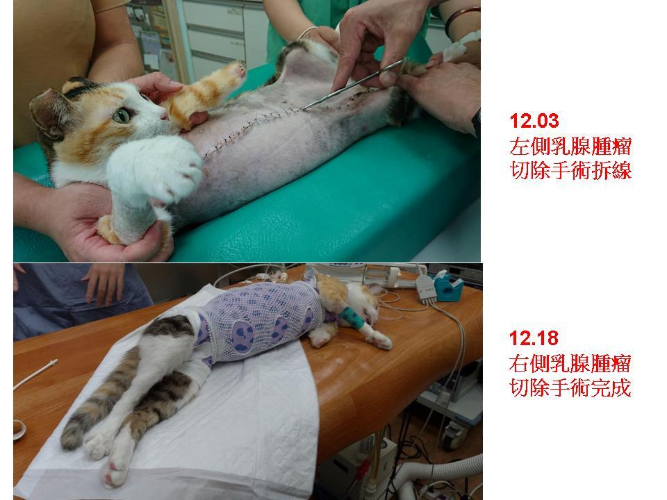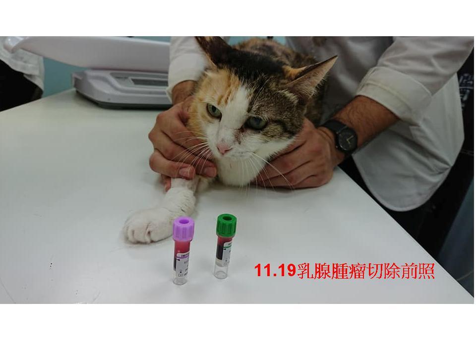 今日血檢,球蛋白正常,腎指數有稍高一點,今日先住院打靜脈點滴,讓指數都穩定一點,接著進行手術,右側乳腺全部摘除,從X光片上看起來有些慢性肺炎,腫瘤部份還好沒有太明顯的轉移,這次手術後再看看咳嗽狀況如何,皮膚還算乾燥,沒有膿在上面,所以黴菌藥照舊,術後再評估需不需要更改抗生素用量,手術傷口會較大,所以需要包紮,4-5天後回診檢查傷口再包紮一次,大約兩周後再拆線。