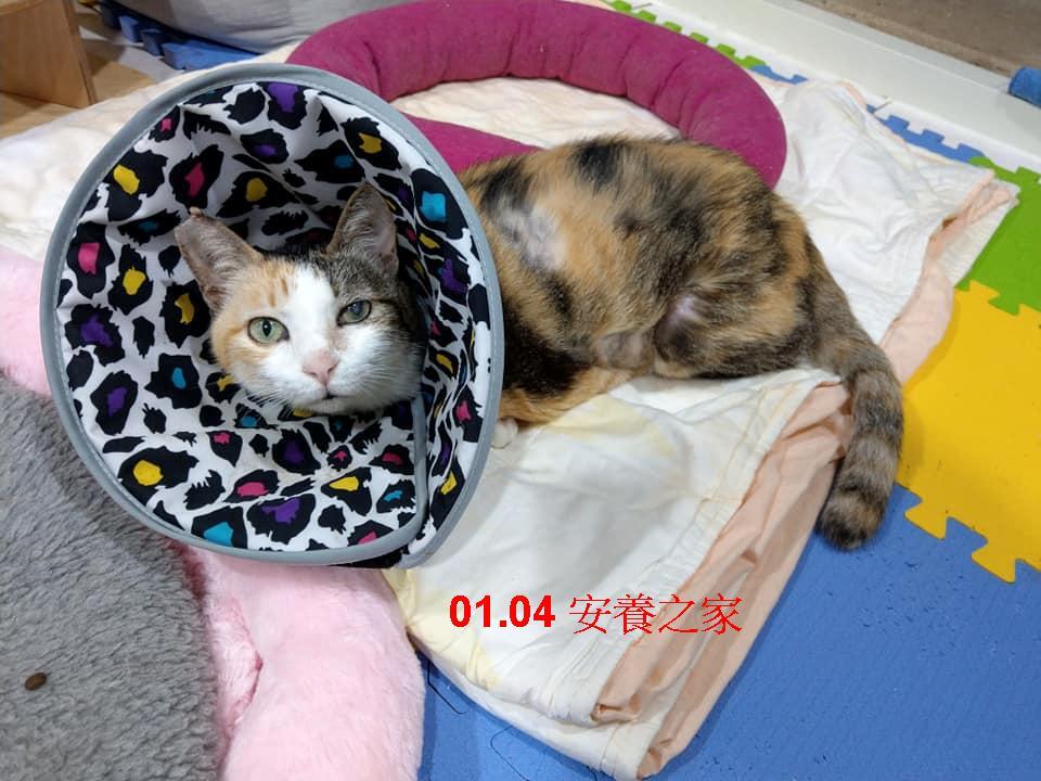 雷夢娜第二次乳房切除手術完成出院,食慾精神都不錯,頭套暫時不可拆下以防她舔傷口,請特別注意保持傷口乾燥。