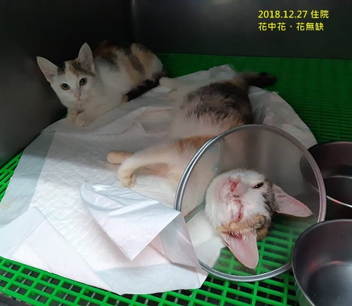 工作人員為三隻小貓取了可愛的名字分別是「爆米花」、「花中花」、「花無缺」的花字系列,「爆米花」因症狀較輕微,住院至第四天,狀況好轉可出院,協會將她接回安養之家,「花中花」於12月29日康復許多接著出院,「花無缺」則因眼睛沾黏、鼻涕情況最嚴重,至2019年1月5日方才穩定出院住進安養之家與姐妹「花中花」團聚。