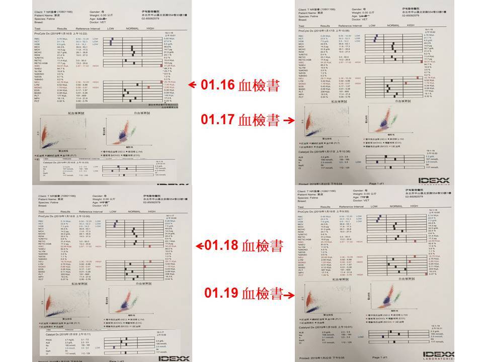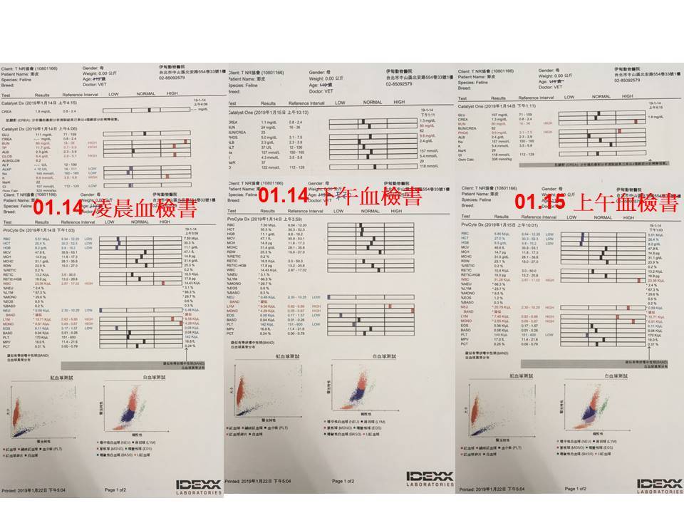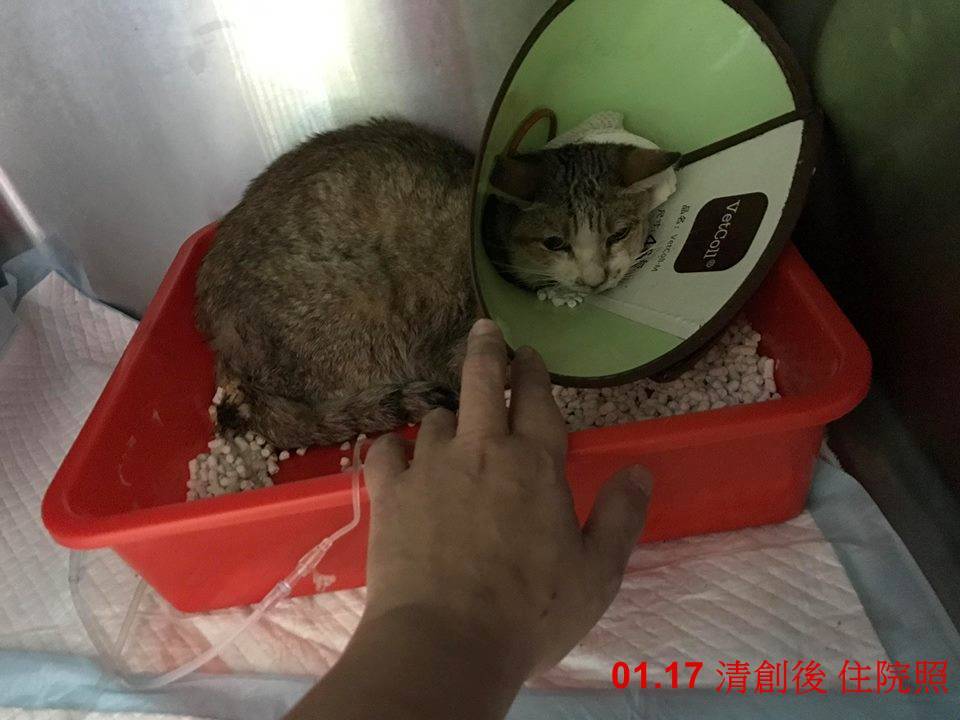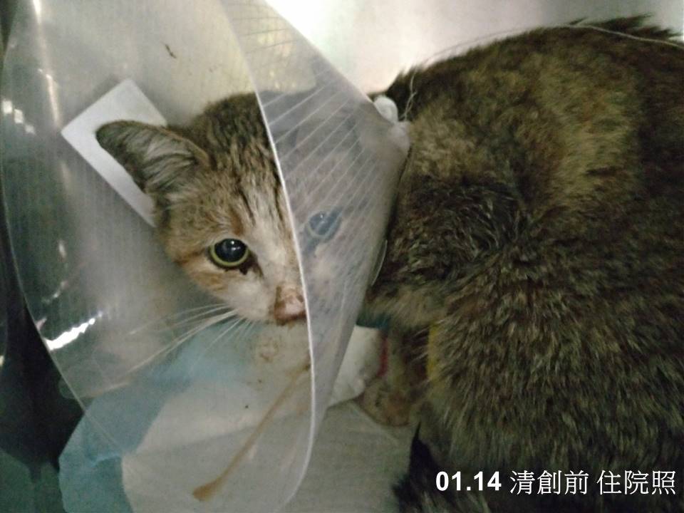 澎皮的血溶比持續下降、白血球持續上升,表示目前使用的抗生素類型無法有效控制感染,所以於1月15日進行清創手術及細菌培養,沒想到麻醉後仔細檢查才瞧見,澎皮在左側臉頸處也有傷口造成的感染,在清創了傷口後也加裝食道餵管餵食,希望能先將貓咪狀況穩定住,隔兩日再血檢,白血球的數值終於下降,且靠餵食管灌食後,澎皮整體狀況漸漸穩定,不過每當有人靠近時仍是很緊張的哈氣。