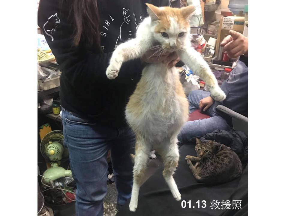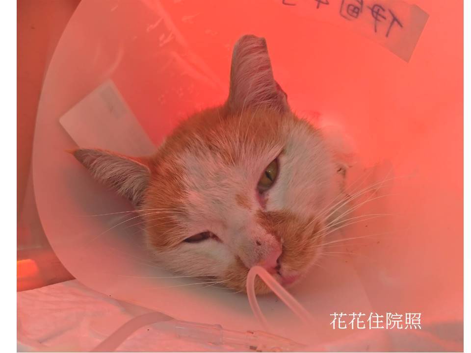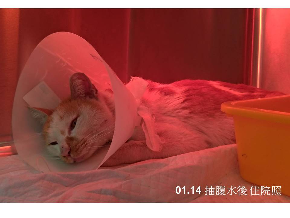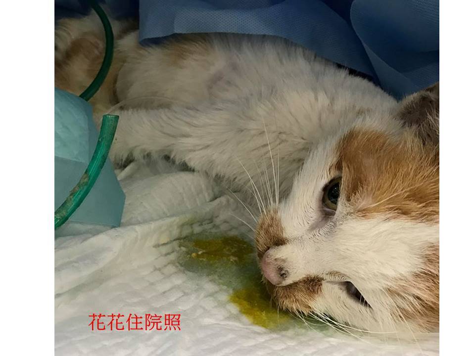 因為接到貓咪的時段已晚,再加上協會內貓口眾多,沒有多餘的空間可以隔離,所以送至有24小時的伊甸動物醫院,大肚子花花一開始懷疑是感染了FIP(傳染性腹膜炎),需檢驗才能確定病因;在抽出了1500CC的腹水後,花花顯得有精神活力多了,且大吃大喝的與FIP的症狀又不逕相同,尚不能排除,但也有可能是腹腔有發炎與感染,都仍需再進一步觀察。