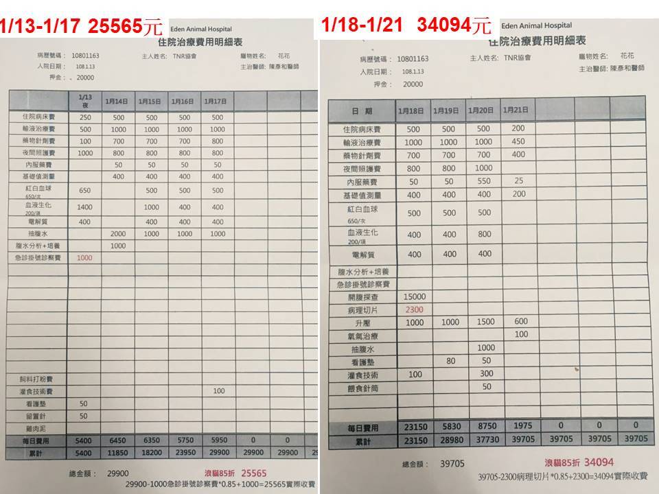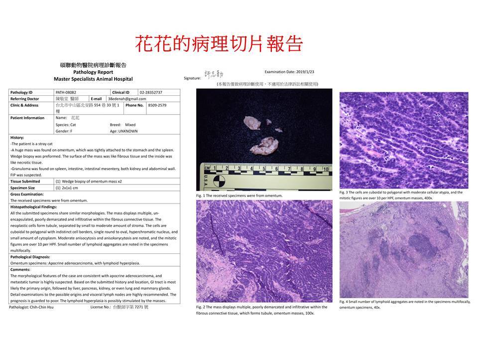花花的病情從一開始疑似FIP、腹腔發炎感染、寄生蟲過多到需開腹送檢,這段時間對於病因推測的曲折,加上院方也已盡可能提供各類藥品,在歷經近10天的醫療,花花仍是撐不過這一關離開了我們,1月24日與醫師聯繫得知病理切片結果出來了,確認花花是惡性腺體瘤,同時也是導致花花死亡的主因。本筆醫助是花花在1月13日到1月21日於伊甸動物醫院的醫療相關費用,希望大家可以一起幫忙大肚子花花,謝謝大家。