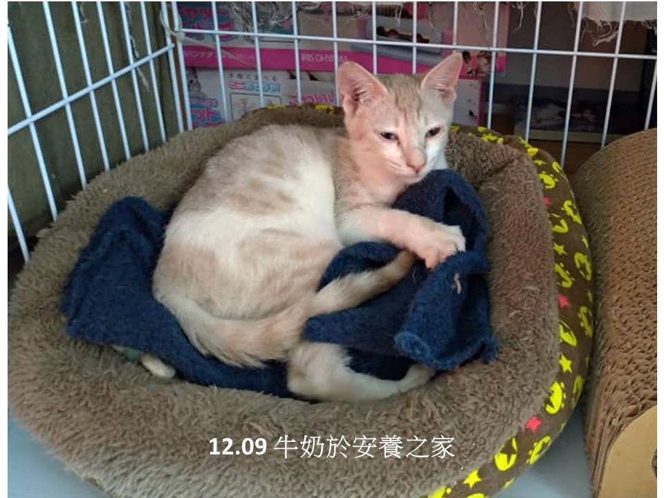 在11月間,協會工作人員前去再度執行結紮任務時,將生病小貓們帶回台北的配合醫院治療,小貓們皆患有上呼吸道感染、跳蚤及體內寄生蟲、體重過輕,全數住院治療觀察,俟呼吸道疾病痊癒,協會便將貓咪們接回安養之家住下並等待送養,但因為有更換環境再加上身體較弱,所以返回安養之家後仍有些感冒症狀,因此奶茶在12月2日、牛奶在12月6日、13日分別有到醫院就診拿感冒藥服用。