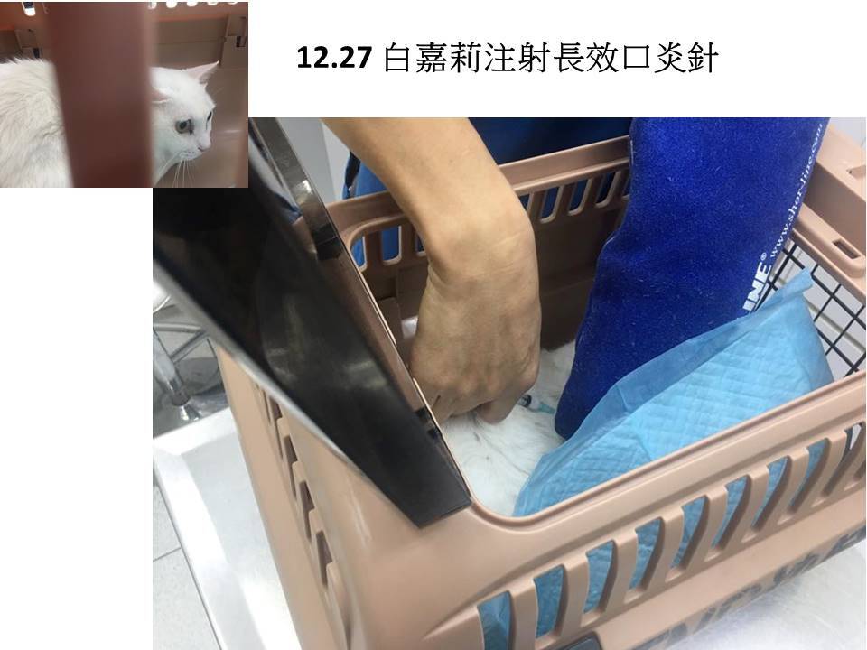 因近日白嘉莉食慾不佳、懷疑是否有口炎問題、醫師表示因沒有空腹、無法鎮定檢查、先打長效口炎針、效用可維持一個月、請觀察三天看食慾有無進步、有進步代表是口炎問題、需麻醉做口腔治療、若食慾依舊不佳、則可能有其他問題需要做進一步血液檢查。