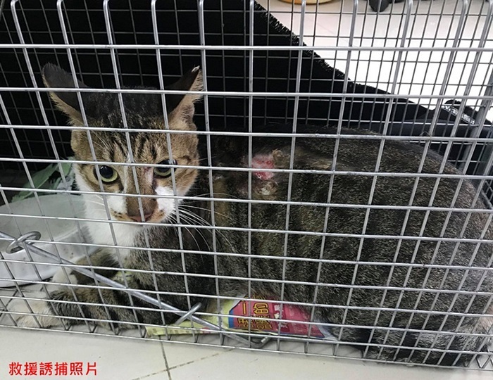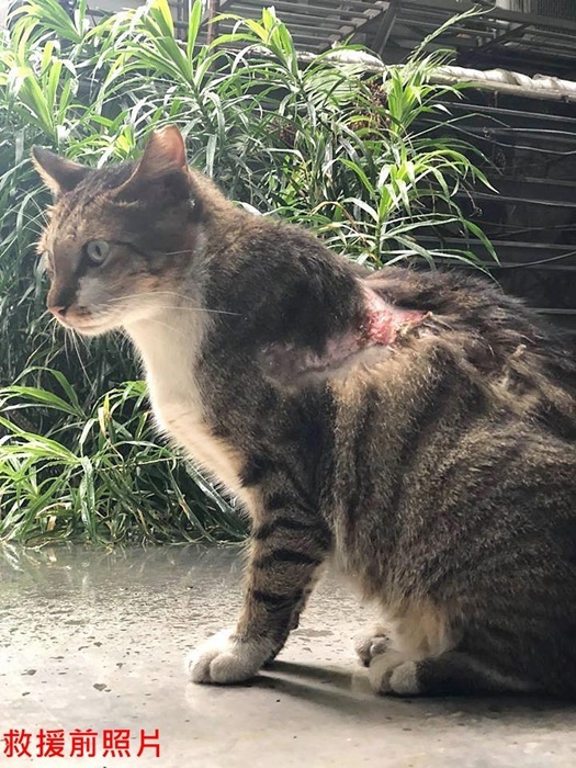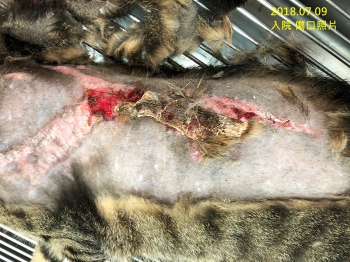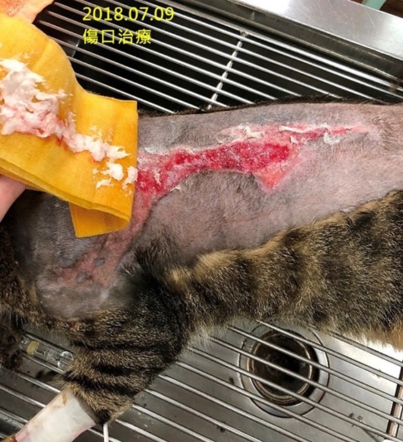 倫倫原本是有好心人餵養的街貓,個性相當乖巧溫和,沒想到被變態盯上,在5月底被潑灑後肢、7月初被潑灑背部,造成背上及後肢都有大片潰爛傷口,協會接獲通報,工作人員立即前往誘捕將他送醫。