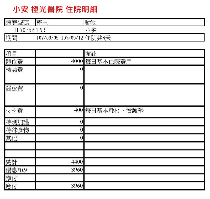 本筆醫助為小安於沐恩住院期間,適逢連假沐恩員工旅遊,因此由沐恩醫師備妥醫囑,協助在2018年9月5日至2018年9月12日至極光動物醫院住院觀察的費用,希望大家可以一起幫忙,謝謝。