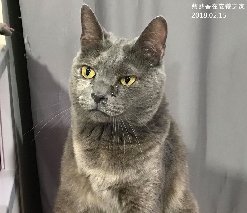 藍藍香是協會在2013年從收容所救出的貓咪,當時她因被補獸鋏夾住,兩條前肢已化膿腫脹,渾身散發著惡臭,嚴重的鼻氣管炎,還懷有身孕,原本已被列入安樂死名單,協會志工接到通知,一早立即趕去將她接出送醫。