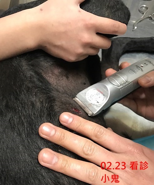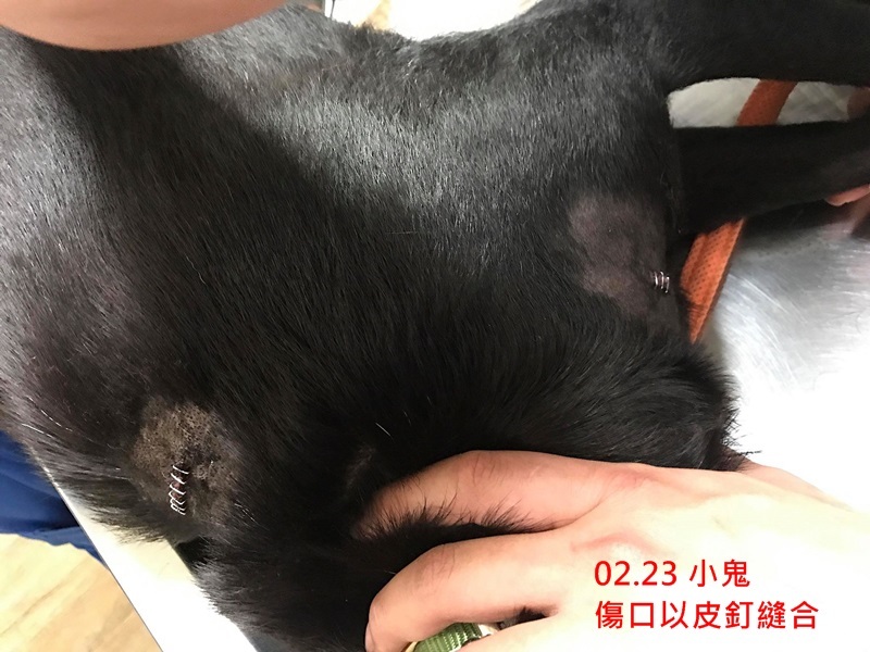黑狗狗小鬼在剃毛後發現身上有多處被咬的傷口,應是狗狗們在放風時間玩耍嬉鬧所造成的,醫師幫小鬼清創、以皮釘釘合傷口。