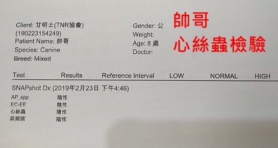 醫師為帥哥進行血檢、心絲蟲檢驗,結果心絲蟲檢驗為陽性,須投藥治療。