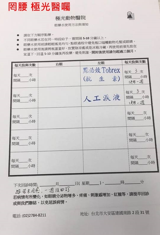 2019年2月照護人員發現罔腰妹妹眼睛出現淚眼,因此立即安排至極光醫院掛診眼睛專科檢查,