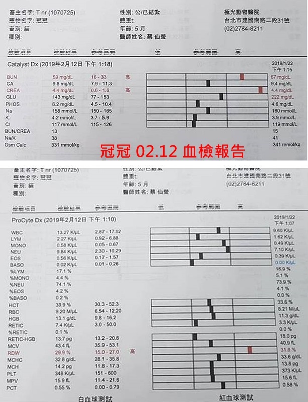目視口腔情形良好,觸診淋巴結無腫脹,血檢結果造血針在改回每週一次後紅血球指數有上升,腎指數持平 (Bun67->59/,Crea4.4->4.4),磷上升(4.6->6.2)其他指數皆在標準值內。對於冠冠的食量減退,排除了口腔問題,飼料部分可以試著泡軟,因冠冠全口拔牙,軟飼料也許可以有幫助。#由於磷上升,#罐頭的部分要盡量選擇低磷(0.5%)以下,#另造血針則改為十天一次。