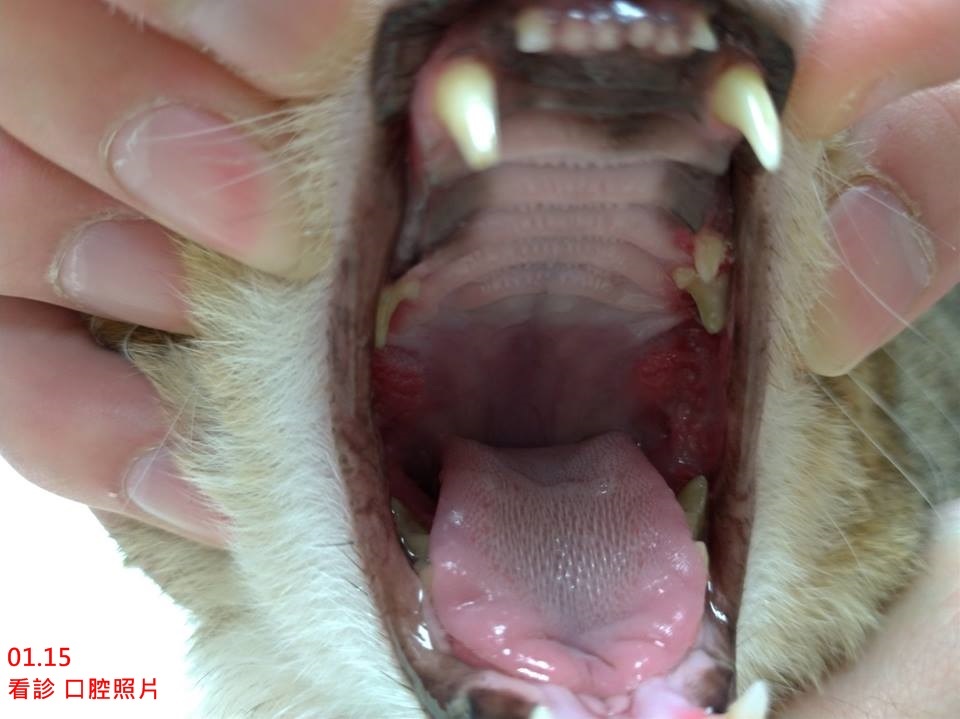 旺寶體重並無明顯下降,口腔內左右二側上排牙齦都有紅腫,因為很靠近牙齒,而不是在接近喉部的黏膜上,所以暫時可排除口炎的問題,建議先進行牙周治療,並在手術途中順便檢查一下牙齒的狀態。