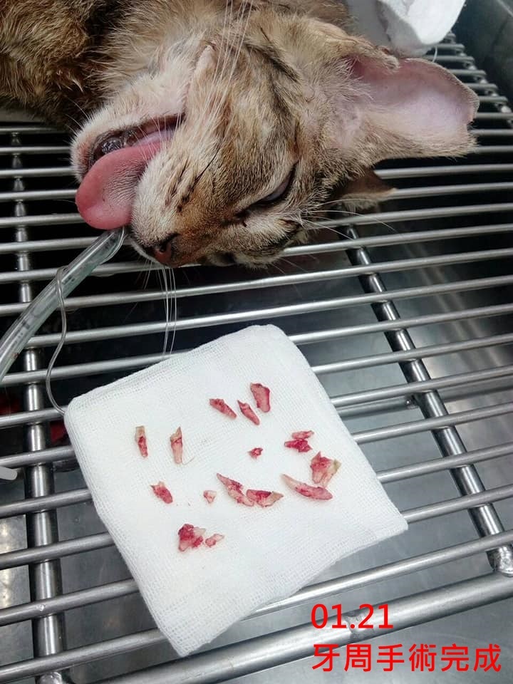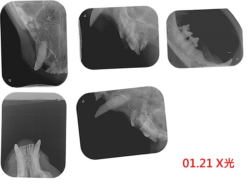 因此在1月21日進行牙周手術將後方全數牙齒、及前方軟組織已潰爛的一顆犬牙拔除,